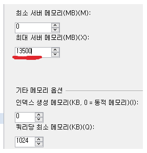 (최저치로 내렸다, 사용 메모리의 최대치로 조정 하였음. 아래 표 참조)