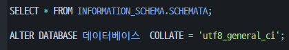 ALTER DATABASE 데이터베이스이름 COLLATE = '콜렉션이름';